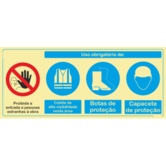 Compostos - "Uso Obrigatório de: Proibida a entrada de pessoas estranhas à obra Colete de alta visibilidade nesta área Botas e capaete de proteção"